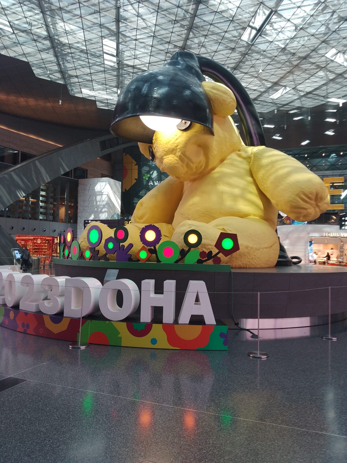 W trakcie podróży lotniczej i związanej z nią przesiadki w Doha (Katar) spotkała mnie i moją partnerkę niemiła niespodzianka. Lot powrotny z drugiego, azjatyckiego domu, do Polski został przesunięty o całe 5 godzin. W związku z tym spacerowaliśmy sobie po lotnisku, oglądając różne ciekawe rzeczy. A to poziome, ruchome schody dla leni, a to różne wielkie misie, w tym ogromnego, żółtego Teddy’ego (na zdjęciu powyżej).