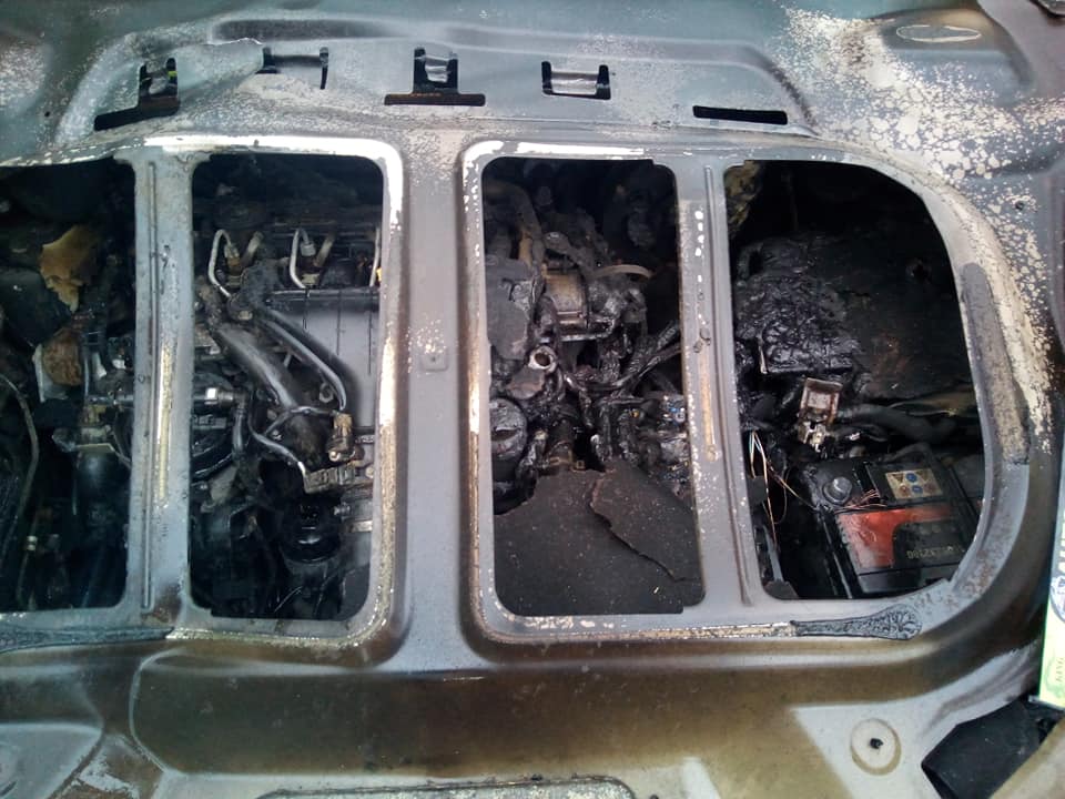 • W samochodach francuskich (także w Renault) od dawna stosuje się pokrywy maski z tworzywa sztucznego (są lżejsze i nie korodują). To dlatego maska wygląda w taki sposób (zostało metalowe wzmocnienie, tworzywo się całkowicie spaliło).