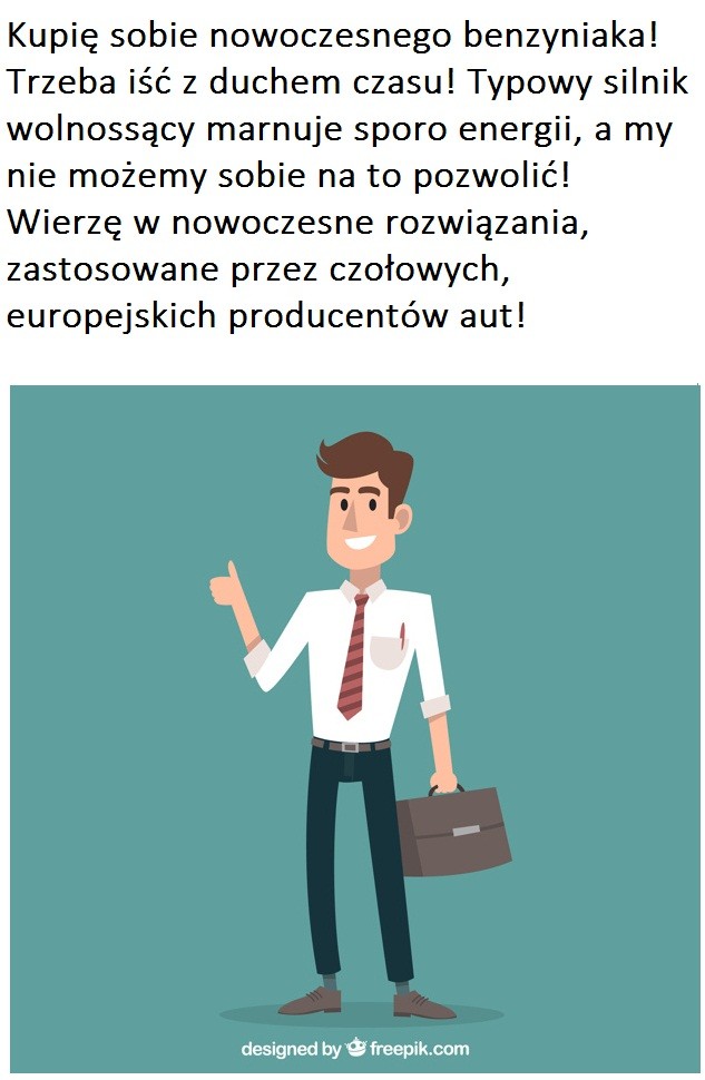 Wynalazek z ostatnich lat, mający rzekomo zrewolucjonizować motoryzację. Nie zrewolucjonizował. Jest bardziej skomplikowany i droższy w naprawie i serwisowaniu od swojego wolnossącego brata. Ciągle nie pojawiły się żadne przekonujące dane, które rozmyją podejrzenia o niską trwałość. Auto z małolitrażowym benzyniakiem to rozwiązanie dla kogoś, kto często porusza się w mieście, a mało na trasach. Dlaczego? Bo miniaturowe wysilone wynalazki bardzo dużą palą przy większych prędkościach. Specjaliści przestrzegają przed tym, że taki silnik ma „duże wymagania serwisowe”. A który ich nie ma? Wolnossąca jednostka też takowe ma, ale jeśli użytkownik przestanie o nią dbać, to popsuje się znacznie później, niż silnik małolitrażowy. Olej trzeba wymieniać w każdym silniku, w każdym aucie musi być sprawny układ chłodzenia, drożny filtr powietrza itd. Dynamiczna jazda zaraz po starcie zniszczy tak samo małolitrażowego benzyniaka jak i silnik wolnossący. Z tym, że w przypadku małolitrażowej miniatury najwcześniej podda się turbina. Kupując auto z takim silnikiem trzeba liczyć się z tym, że części są drogie (świece zapłonowe kosztują nawet 6 razy więcej, co wolnossącego), silnik jest doładowywany przez turbinę (trzeba ją odpowiednio traktować i liczyć się z tym, że będzie trzeba ją wymienić), układ bezpośredniego wtrysku paliwa jest bardzo czuły i delikatny (wtryskiwacze i pompy wysokiego ciśnienia są drogie, ale nie tak drogie, jak w przypadku diesli), a niemal każde auto posiada sprzęgło, współpracujące z dwumasowym kołem zamachowym. Zatem, silnik będzie w miarę mało palił podczas jazdy po mieście, ale znów częsta jazda po mięście wykończy dwumasowe koło zamachowe i sprzęgło (a to będzie parę tysięcy złotych). Są też podatne na problemy z nagarem, pojawiają się w nich awarie łańcucha rozrządu.