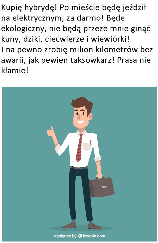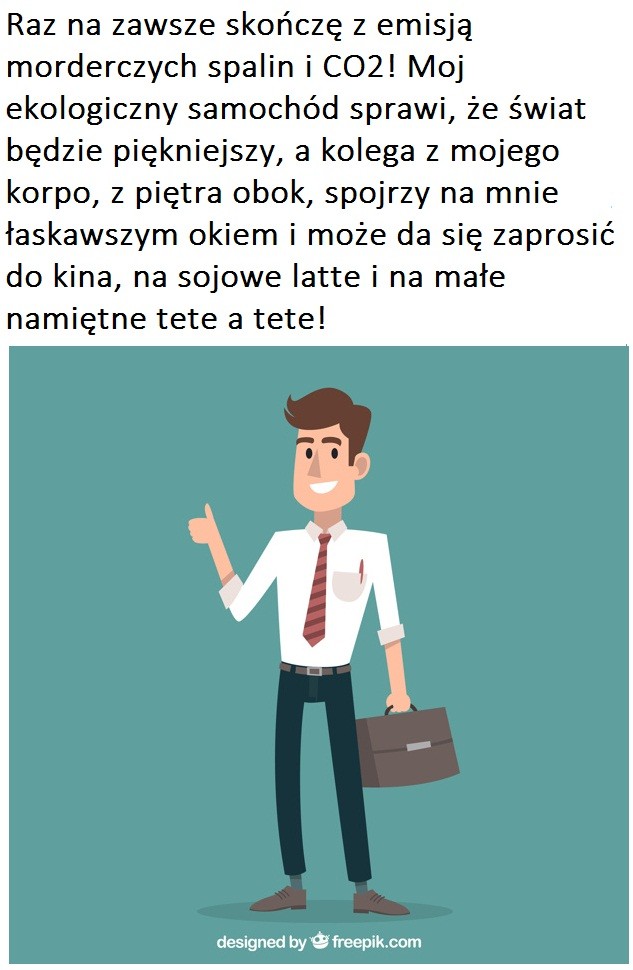 Czarny humor w najlepszym wydaniu. Największa ściema ostatnich lat. Wynalazek z silniczkiem elektrycznym i bateryjką ważącą kilkaset kilogramów, zawierającą najgorsze możliwe świństwa, uznany za pojazd ekologiczny.