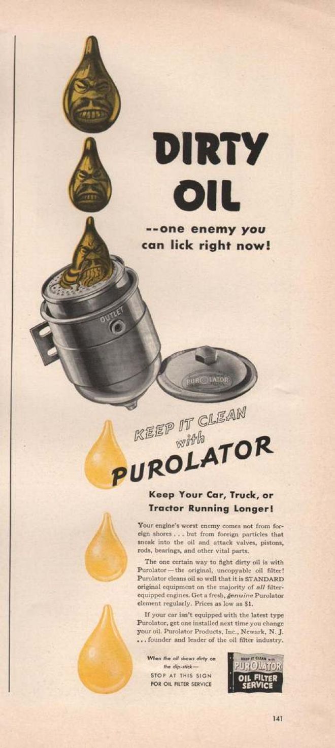 Pierwszy filtr oleju z prawdziwego zdarzenia, prekursor dzisiejszych rozwiązań, powstał w 1923 roku. Był to tzw. Purolator, stworzony przez Ernesta Sweetlanda. Filtr miał metalową obudowę, w której zamontowano maty filtrujące, pomiędzy stalowymi płytkami.