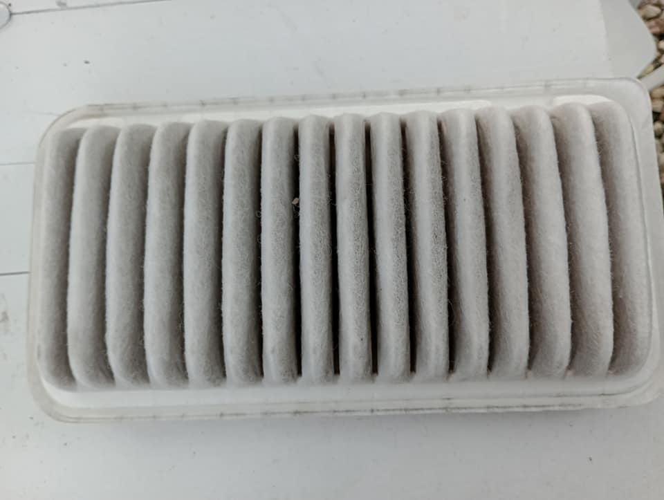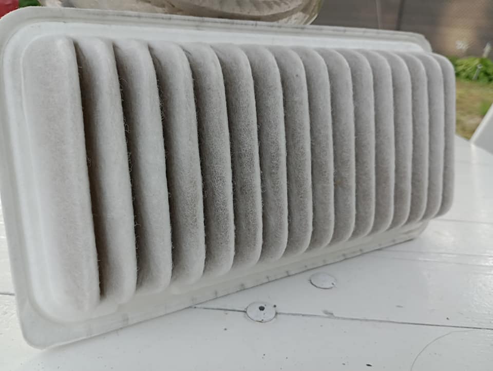 Jest. Oto on. Filtr powietrza. Przepracował ok. 14 miesięcy pod maską Toyoty, chroniąc jej benzynowy silnik przed kurzem, piaskiem i innymi brudami. Zatrzymał ich sporo, co widać po jego kondycji. Jest trochę zabrudzony. Wykonany jest z materiału, który przypomina połączenie lekkiej styropianowej pianki i włókniny.