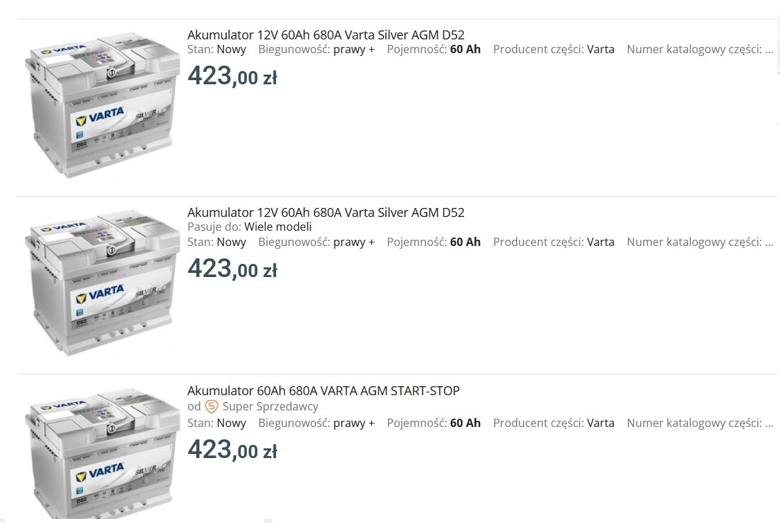 Dobry akumulator AGM o pojemności 60Ah kupimy za 423 złote. Niemiecka Varta.
