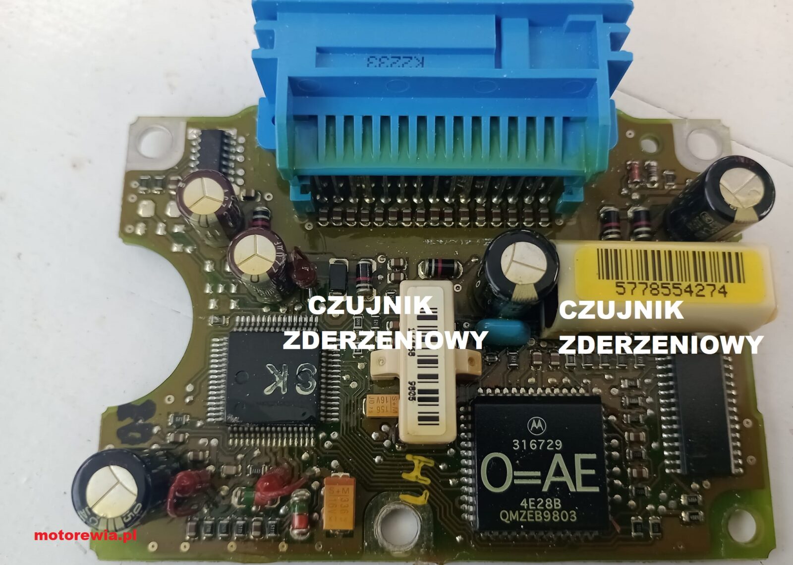 Na płytce zamontowane są również dwa – > wewnętrzne czujniki zderzeniowe. To właśnie ze względu na nie sterownik SRS musi być zamontowany w odpowiedni sposób, zgodnie z kierunkiem jazdy do przodu. Dlatego na obudowie sterownika umieszczana jest strzałka, wskazująca kierunek do przodu.